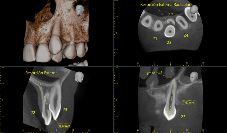 En esta ocasión, al paciente se le realiza una tomografía en zona 22-23, en esta podemos observar como el diente 23 esta impactado parcialmente a vestibular (cara del diente que se encuentra en relación con los labios y carrillos) del 22, en posición Vertical, causando reabsorción externa radicular severa en el 22. La raíz es de presentación central y el ápice está en la confluencia del seno maxilar y la fosa nasal, más cercana a la fosa nasal.